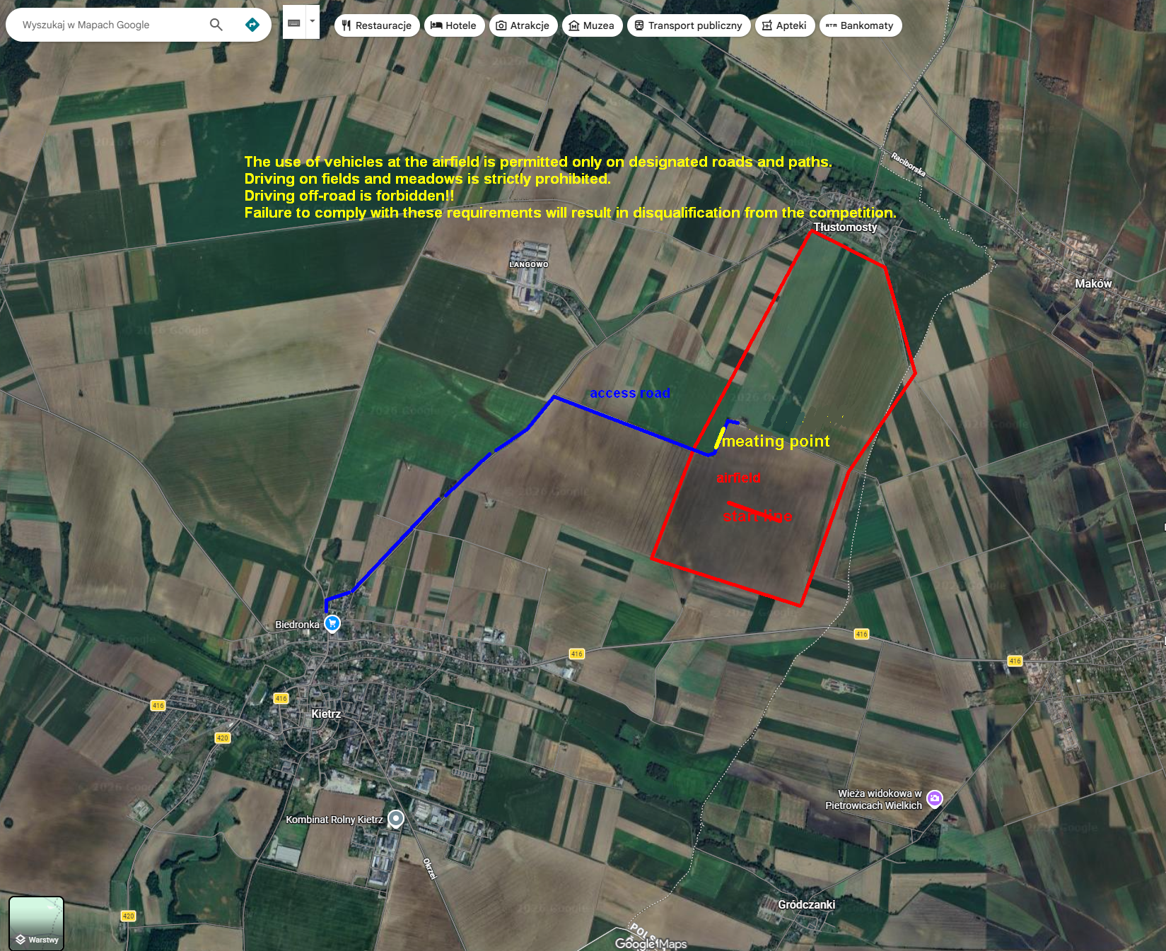 The use of vehicles at the airfield is permitted only on designated roads and paths. Driving on fieds and meadows is strictly prohibited. Driving off-road is forbidden!! Failure to comply with these requirements will result in disqualification from the competition.